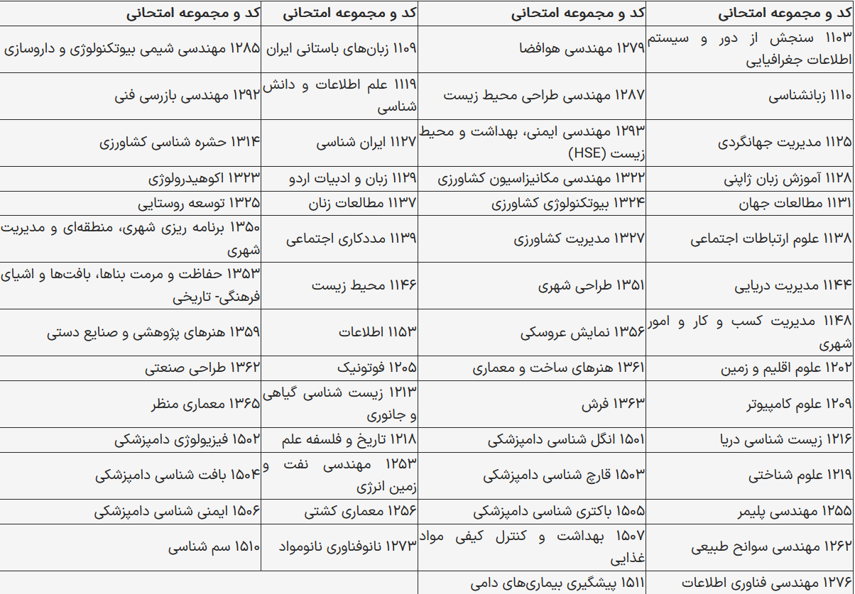 جدول کد و نام مجموعههای امتحانی دوم (شناور)