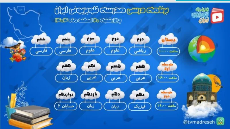 برنامه درسی مدرسه تلویزیونی ایران برای امروز چهارشنبه ۲۰ اسفندماه اعلام شد.