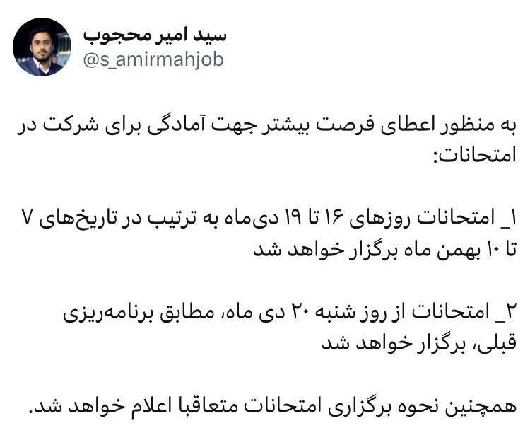امتحانات روزهای ۱۶ تا ۱۹ دی ماه به ترتیب در تاریخهای ۷ تا ۱۰ بهمن ماه ۱۴۰۴ انجام خواهد پذیرفت.