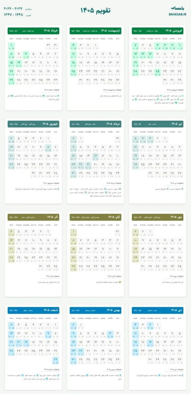 تقویم سال 1405 به همراه تعطیلی های آن منتشر شد.