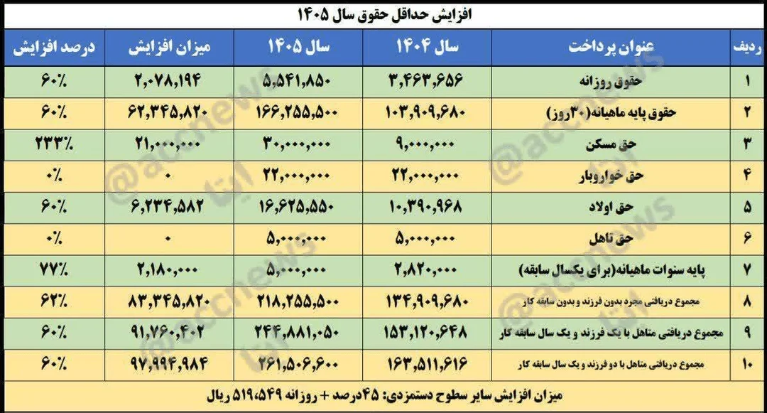 به حداقل مزد روزانه در سال ۱۴۰۵ مبلغ ۵ میلیون و ۵۴۱ هزار و ۸۵۰ ریال و حداقل مزد ماهانه ۱۶۶ میلیون و ۲۵۵ هزار و ۵۰۰ ریال شد.