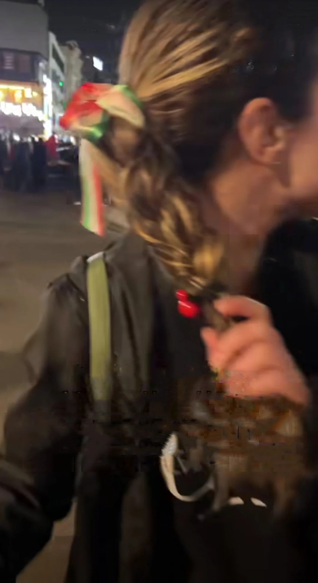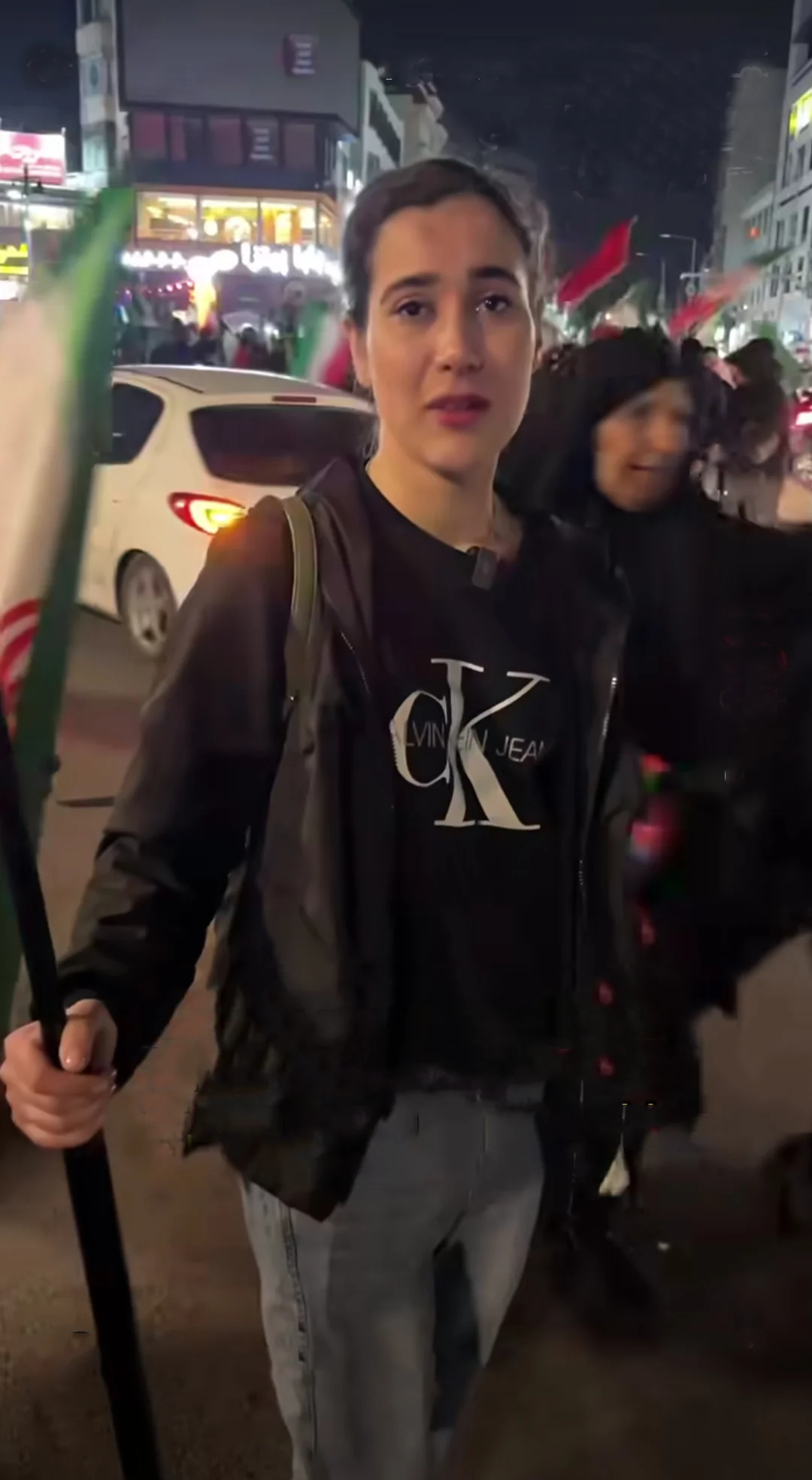 دختر از حوادث دی ماه میگوید که او هم معترض بوده. ولی میگوید این راهش نیست. او از بچههای مظلوم میناب میگوید... او که بلندترین پرچم را در میان تجمعکنندگان در دست گرفته بود... او میگوید 18 و 19 دی بین معترضان بود ولی فقط نتیجهاش این بود که جوانها پرپر شدند... او میگوید در پی تجاوز صهیونیستها و آمریکاییها حالا وقت حمایت از وطن است...