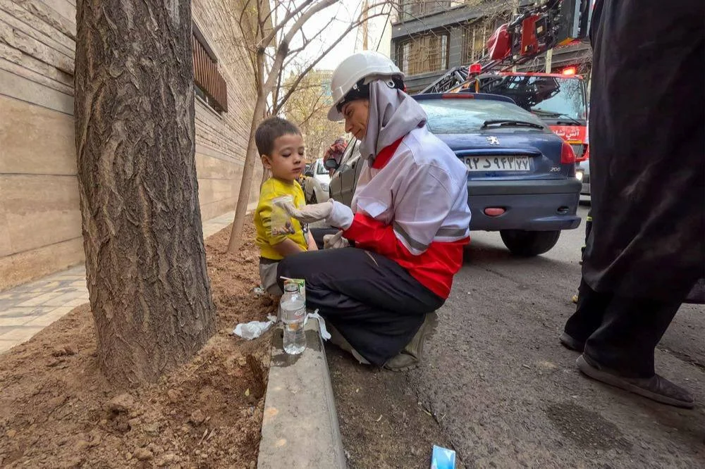 امدادگر مهربان هلال احمر را میبینید؛ جزئیات عکس هم این است. یک بطری آب معدنی، یک پاکت آبمیوه و یک کیسه نایلونی که هرچه دقت کردم نفهمیدم چه چیزی در آن است! دست مشت کرده خانم امدادگر هم چیزی باید در آن باشد که نگاه کودک را به خود خیره کرده. با همین چیزهای به ظاهر کم اهمیت، ذهن این کودک را زبانم لال از یک فاجعه بزرگ دور کرده.