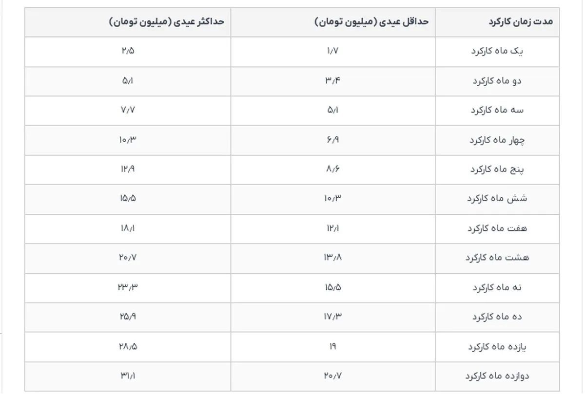 این جدول نشان میدهد که هرچه مدت زمان کارکرد کارگر بیشتر باشد، حداقل و حداکثر عیدی نیز افزایش مییابد.