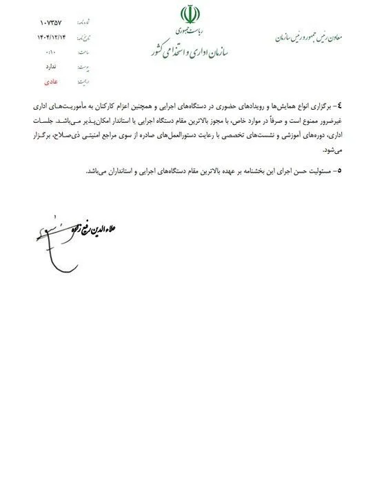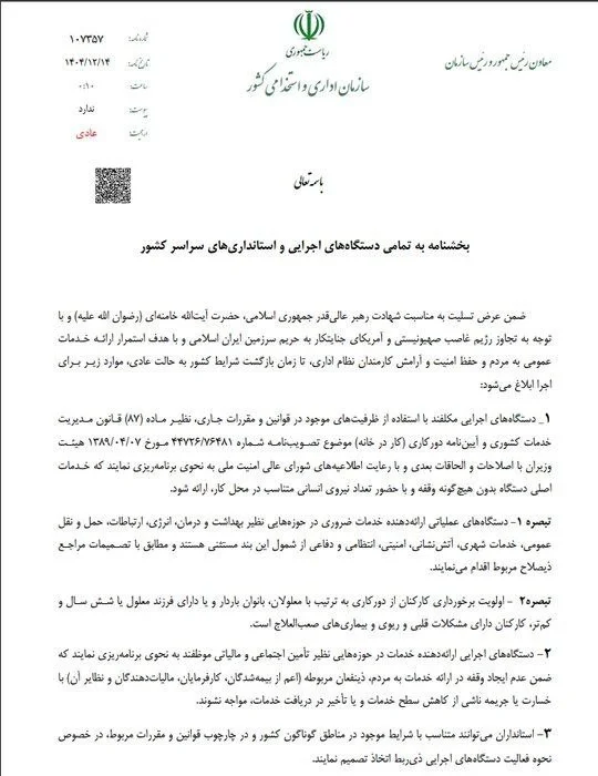 سازمان اداری و استخدامی کشور نحوه فعالیت دستگاههای اجرایی پس از تعطیلات نوروزی را اعلام کرد که بر این اساس بخشنامه اسفند سال گذشته به قوت خود باقی است.