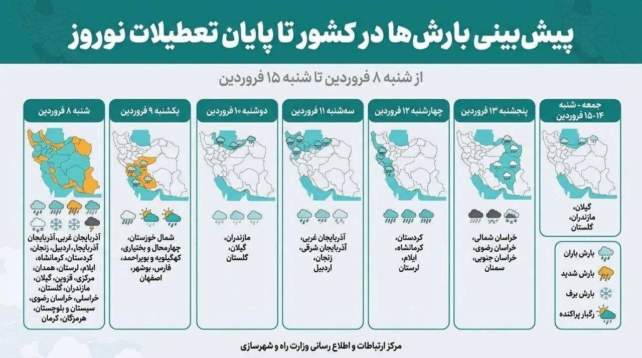 پیشبینی وضعیت بارشها در کشور، از شنبه ۸ فروردین تا شنبه ۱۵ فروردین منتشر شد