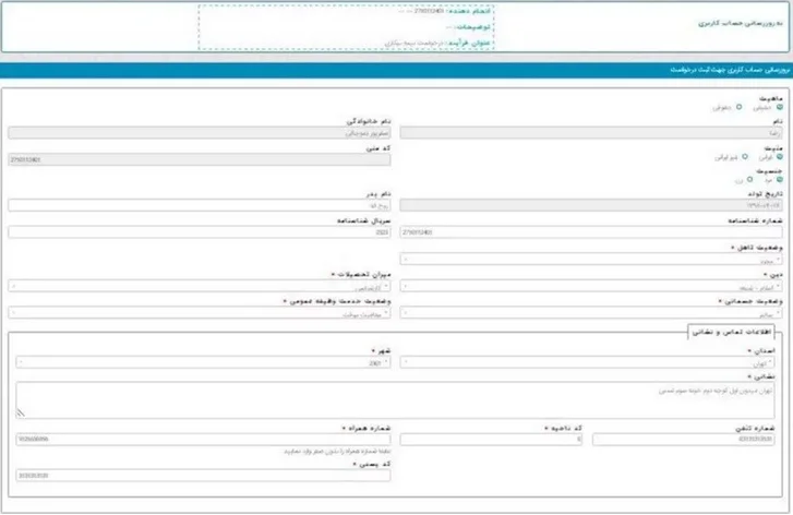 - بهروزرسانی اطلاعات حساب کاربری: پس از انتخاب گزینه «ثبت درخواست بیمه بیکاری»، از شما خواسته میشود تا اطلاعات حساب کاربریتان را بهروزرسانی کنید. اطلاعات را به دقت بررسی کرده و در صورت نیاز به ویرایش، تغییرات را اعمال کنید. پس از تکمیل اطلاعات، گزینه «ارسال» را بزنید.