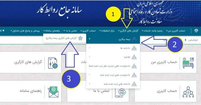 - ورود به پنجره خدمات و ثبت درخواست: پس از ورود به سایت، از منوی بالای صفحه روی گزینه «پنجره خدمات» کلیک کرده و سپس روی گزینه «اداره کل حمایت از مشاغل و بیکاری» کلیک کنید. در صفحه جدیدی که باز میشود، گزینه «ثبت درخواست بیمه بیکاری» را انتخاب کنید.