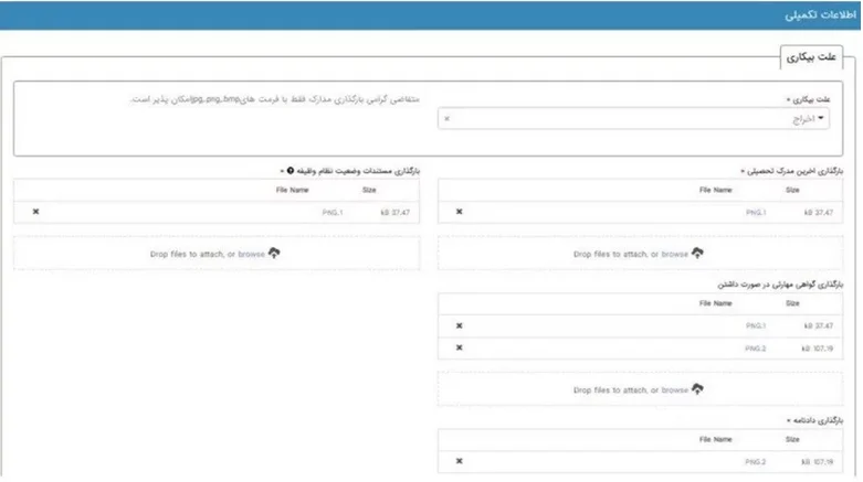 - پس از انتخاب علت بیکاری، به بخش بعدی میروید که در آن باید مدارک خواسته شده را آپلود کنید.