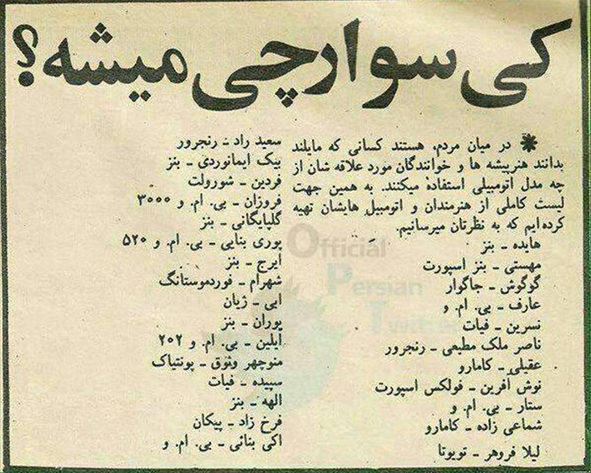 بریده جراید؛ در مطلبی با تیتر «کی سوار چی میشه؟» در یکی از جراید اواسط دهه 50 به این موضوع کنجکاویبرانگیز بین مردم اشاره شده که هنرپیشهها و خوانندههای مورد علاقهشان از چه اتومبیلی استفاده میکنند؛ پوری بنایی: ب.ام.و 520، پوران: بنز، فروزان : ب.ام.و 3000، فردین: شورولت، گوگوش: جگوار، ناصر ملکمطیعی رنجروور، شماعیزاده: کامارو، سعید راد: رنجروور، نوشآفرین: فولکس اسپرت، هایده: بنز، منوچهر وثوق: پونتیاک و…