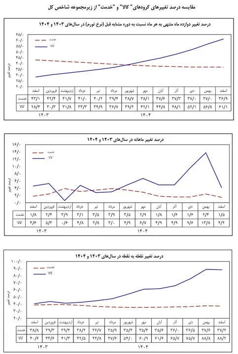 در بخش کالاها، شاخص مربوط به این گروه نیز در اسفند سال گذشته نسبت به بهمن، ۴.۲ درصد افزایش یافت. این در حالی است که تورم نقطهبهنقطه کالاها به ۸۸.۲ درصد و تورم سالانه این گروه نیز به ۳۶.۹ درصد گزارش شد.
