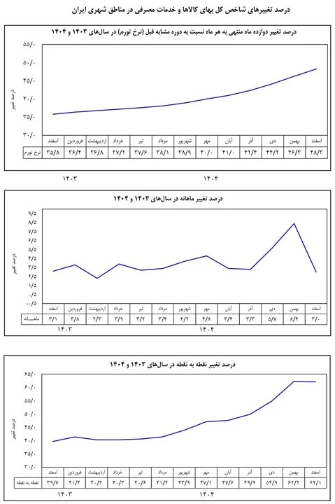بر اساس این گزارش، نرخ تورم سالانه که میانگین تغییرات شاخص در دوازده ماه منتهی به اسفند ۱۴۰۴ نسبت به دوره مشابه پیشین (اسفند ۱۴۰۳) را نشان میدهد، به ۴۸.۳ درصد رسیده است.
