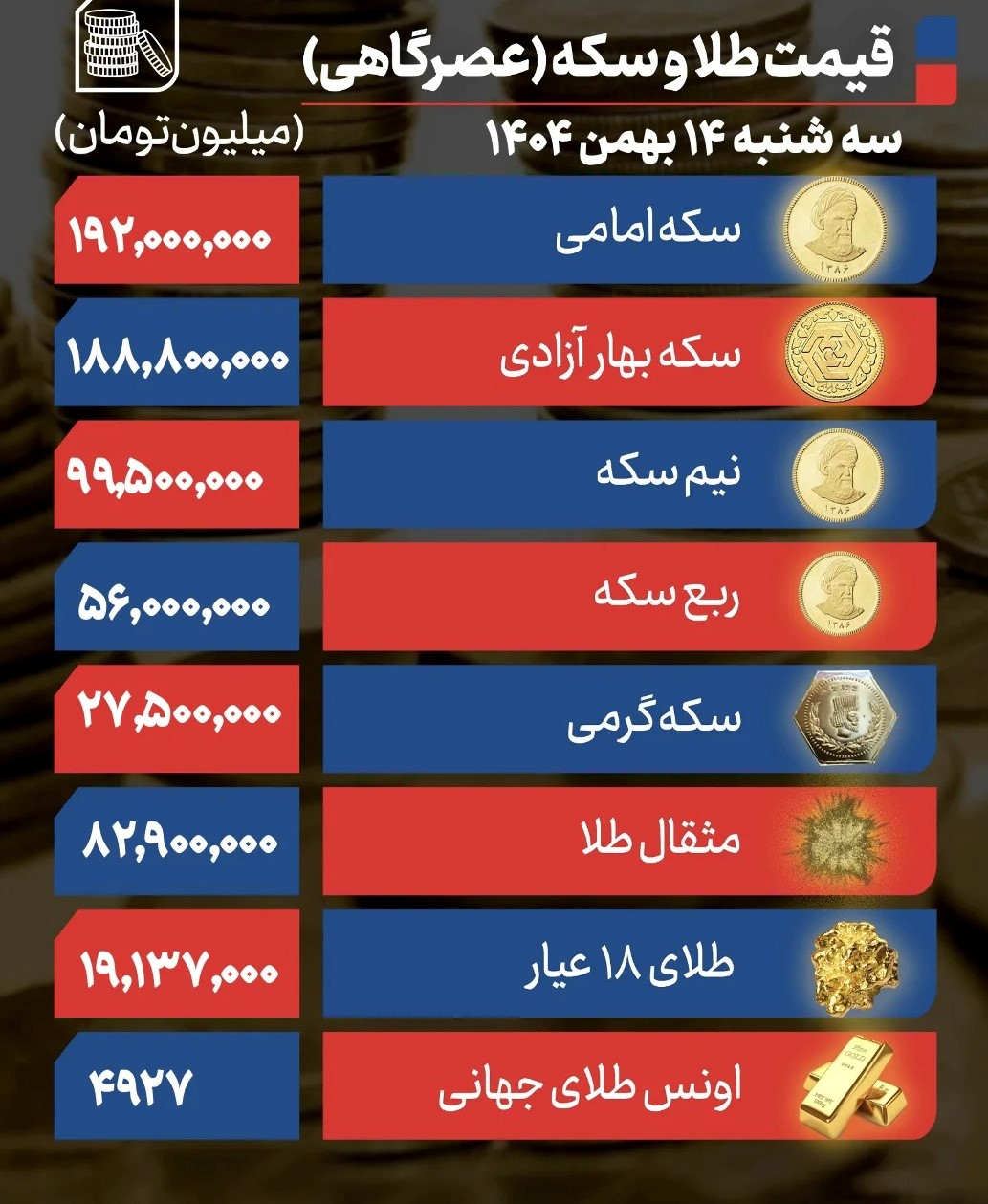 قیمت طلا و سکه روز سهشنبه ۱۴ بهمن ۱۴۰۴ در حالی با افزایش همراه شد که بازار ارز نوسان دو هزار تومانی را تجربه کرد و اونس جهانی طلا رشد پرقدرتی داشت. رشد بیش از ۲۰۰ دلاری قیمت اونس جهانی طلا در کنار افزایش اخبار ناسیاسی تا پایان معاملات بازار فلز زرد را تحت تاثیر قرار داد و صعود قیمت طلا و سکه را رقم زد.