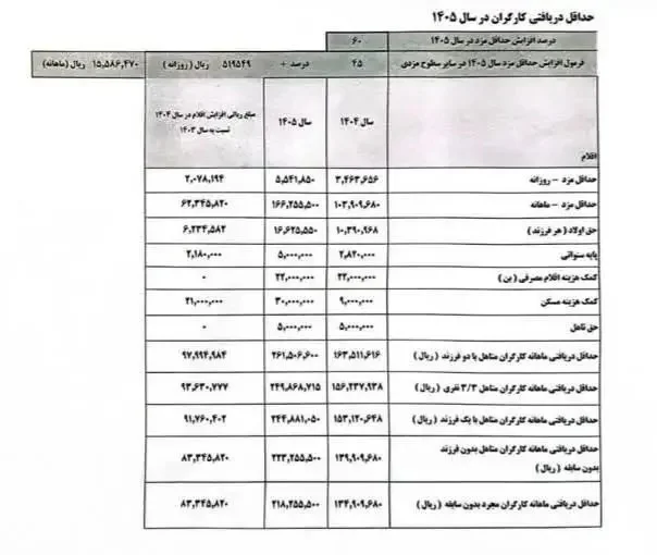 همچنین بر اساس تصمیمات اتخاذ شده در این نشست ، حداقل مزد در سال ۱۴۰۵ روزانه ۵,۵۴۱,۸۵۰ ریال (پنج میلیون و پانصد و چهل و یک هزار و هشتصد و پنجاه ریال) تعیین شد. حداقل مزد ماهانه در سال ۱۴۰۵ ، حدود ۱۶۶/۲۵۵/۵۰۰ ریال و حق اولاد (هر فرزند) ۱۶/۶۲۵/۵۵۰ ریال تعیین شد.