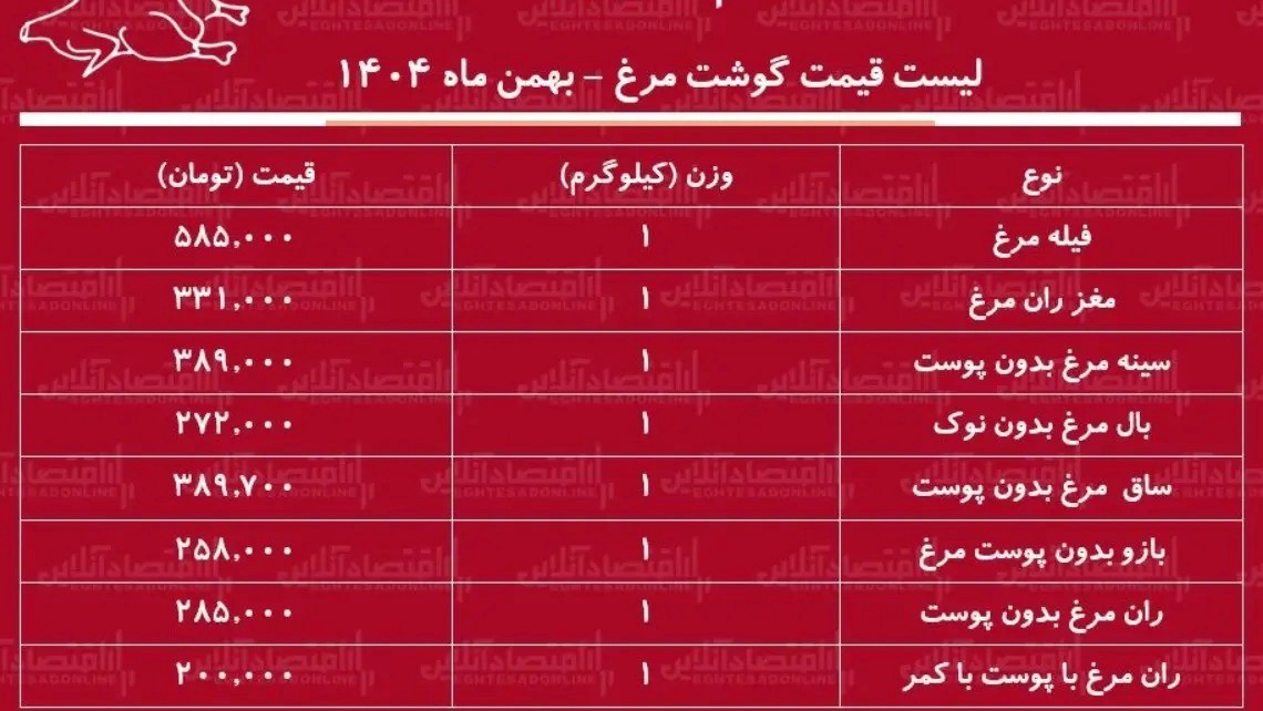 همچنین، «ران مرغ بدون پوست» به ازای هر کیلوگرم با قیمت ۳۰۱ هزار تومان عرضه میشود. «مغز ران مرغ» نیز برای هر کیلوگرم با قیمت ۳۳۱ هزار تومان در بازار به فروش میرسد.