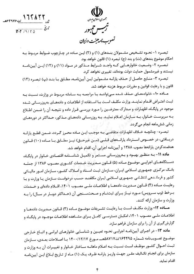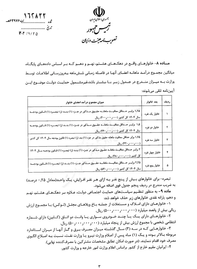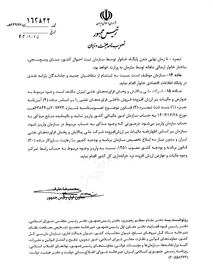 تصویبنامه مصوب جلسه مورخ ۱۴۰۴/۰۹/۱۶ هیات وزیران درخصوص «آیین نامه اجرایی بند چ تبصره ۵ و بند ت تبصره ۱۳ قانون بودجه سال ۱۴۰۴ کل کشور (موضوع جبران قدرت خرید طبقات متوسط و پایین درآمدی جامعه)» با شماره ۱۶۲۸۳۳ در تاریخ ۱۴۰۴/۰۹/۲۵ توسط معاون اول رییس جمهور ابلاغ شد.