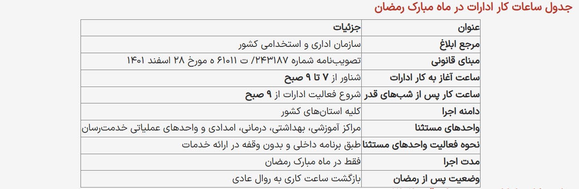 براساس اعلام سازمان امور اداری و استخدامی کشور، ساعت کاری ادارات و بانک ها در شب های قدر از ساعت 9 صبح خواهد بود.