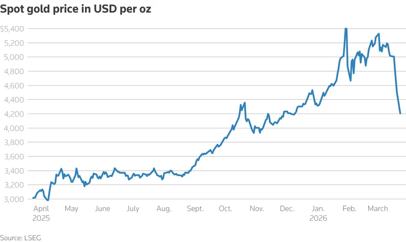به گزارش رویترز، طلا روز دوشنبه بیش از ۵ درصد سقوط کرد و پس از ثبت بدترین عملکرد هفتگی خود در حدود ۴۳ سال گذشته، به پایینترین سطح خود در سال ۲۰۲۶ رسید. تشدید درگیریها در خاورمیانه نگرانیها درباره تورم را افزایش داده و در نتیجه، انتظارات برای بالا رفتن نرخهای بهره جهانی تقویت شده است.