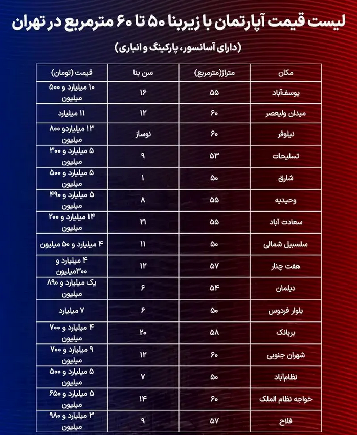 در مرکز تهران برای خرید چنین آپارتمانی، این رقم به 6 میلیارد تومان کاهش مییابد؛ در محله خواجه نصیر طوسی، آپارتمانی 60 متری و دارای امکانات، 6 میلیارد و 500 میلیون تومان و در محله نجات اللهی، واحدی 50 متری و 19 سال ساخت با 6 میلیارد تومان به فروش میرسد