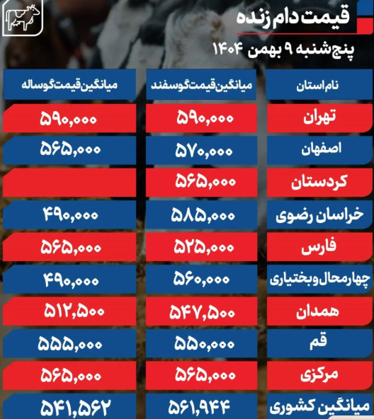 قیمت دام زنده امروز ۹ بهمن ۱۴۰۴ اعلام شد.