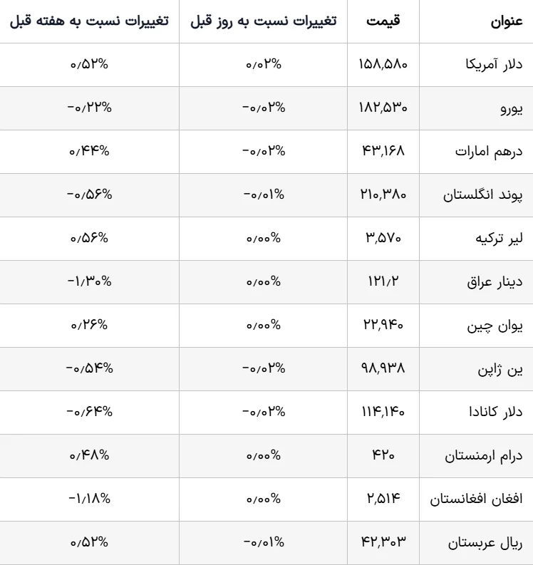 قیمت دلار آمریکا شاهد کمی افزایش قیمت بوده است به طوری که دلار آمریکا امروز ۱۰ فروردین ۱۴۰۵ به ۱۵۸٬۵۸۰ تومان رسید.