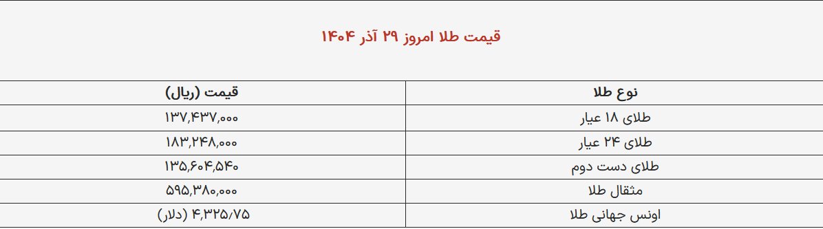 قیمت طلا امروز شنبه ۲۹ آذر ۱۴۰۴
