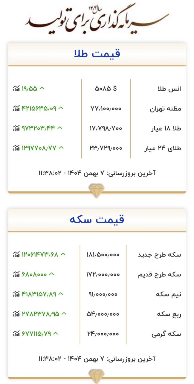 قیمت لحظه ای طلا و سکه امروز سه شنبه 7 بهمن 1404 اعلام شد.