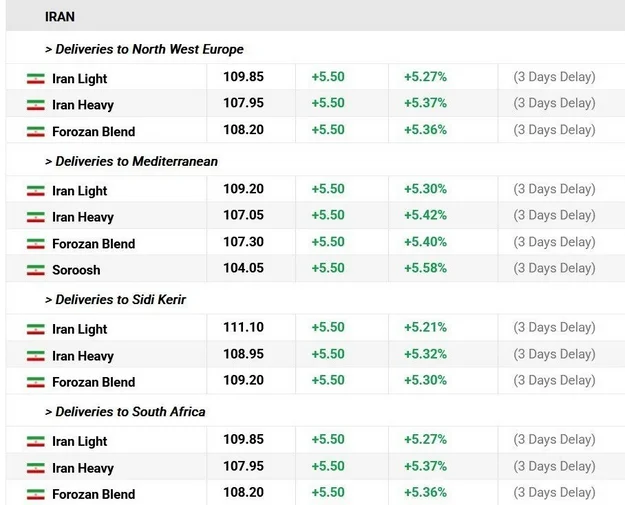 علاوه بر این در مقصد آفریقای جنوبی نیز نفت سبک ایران ۱۰۹.۸۵ دلار، نفت سنگین ۱۰۷.۹۵ دلار و مخلوط فروزان ۱۰۸.۲۰ دلار قیمت خورده است. گفتنی است تمامی این ارقام مربوط به قیمتهایی است که با سه روز تأخیر (۳ Days Delay) منتشر شدهاند.