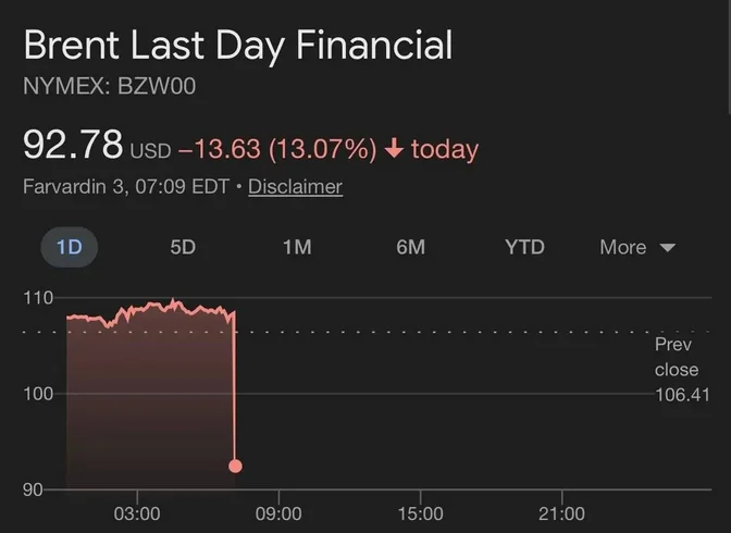 پس از ادعای ترامپ، قیمت نفت تا ۹۷ دلار سقوط کرد و در حال حاضر در مرز ۱۰۰ دلار ایستاده است. بسیاری معتقدند بازی ترامپ در مورد حمله به ایران و پیام اخیرش یکی از حقه های او برای پایین آوردن قیمت نفت بوده است.