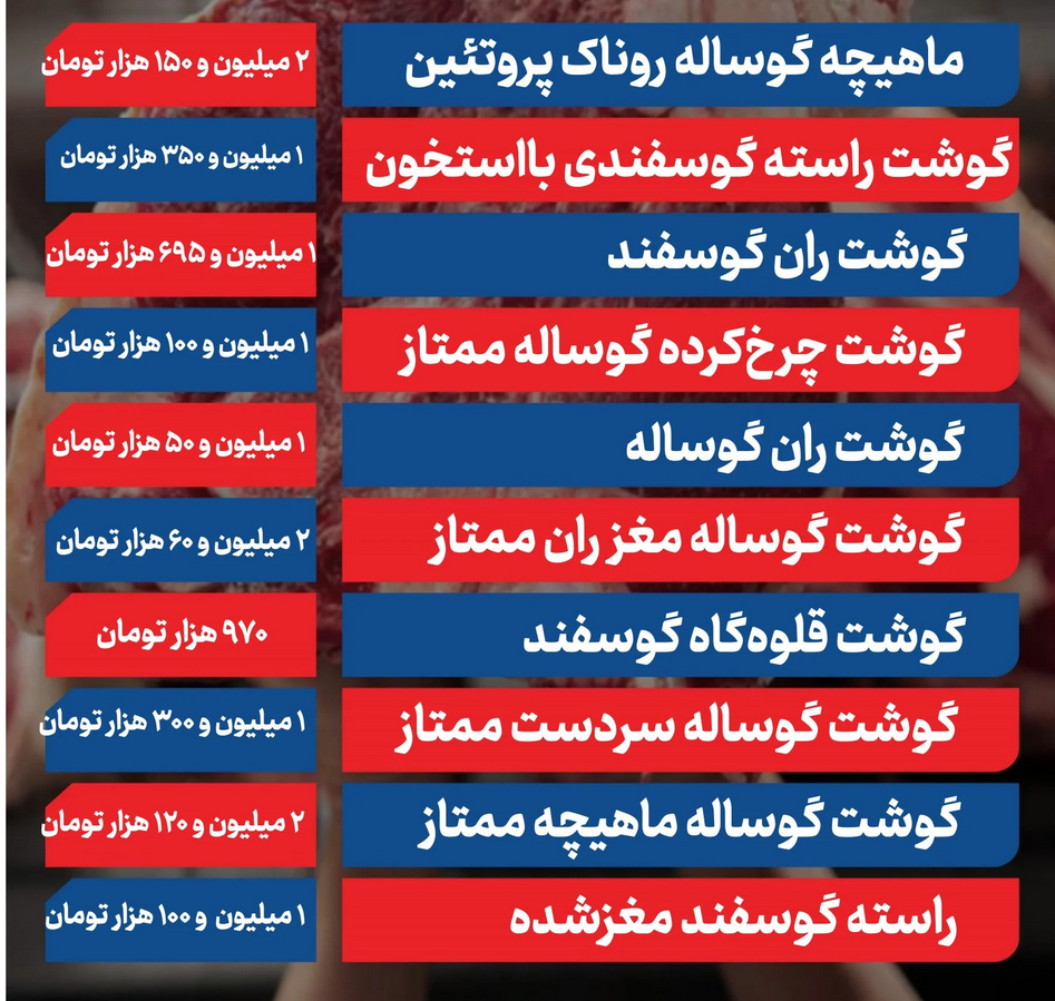 در جدول زیر قیمت انواع گوشت قرمز امروز دوشنبه 27 بهمن 1404 را میبینید.