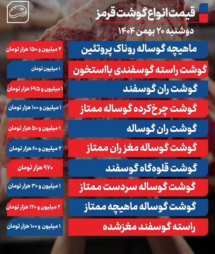 قیمت گوشت قرمز امروز ۲۰ بهمن ۱۴۰۴ اعلام شد. گزارش‌ها نشان می‌دهد که نرخ گوشت گوسفند و گوساله ثابت مانده و جهشی نداشته است. همچنین گفتنی است هیچ اختلال یا کمبودی در دسترسی به محصولات مشاهده نشده است و فعالیت‌ها با ثبات قابل توجه ادامه دارد.