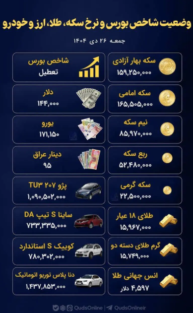 صفحه اصلی•اقتصادیتاریخ خبر: ۲۶ دی ۱۴۰۴ - ۱۵:۱۰نرخ سکه، طلا، ارز و خودرو؛ جمعه ۲۶دینرخ سکه، طلا، ارز و خودرو ره در تاریخ جمعه ۲۶دی مشاهده کنید.مهم ترین اخباربهترین گل های جهان در فوتبال«قربان، طلا، سوسن و زیبا» در پشتصحنه سریال «سوجان»همه چیز درباره کالابرگ ماه رمضان ۱۴۰۴ / پاسخ به 12 پرسش متداولآخرین قیمت طلا و سکه امروز دوشنبه 27 بهمن 1404/ کاهش قیمت طلا و سکهمعرفی فیلم جنایی پدرخوانده + بازیگران و نقشهاطرح زوج و فرد از درب منزل فردا سه شنبه 28 بهمن ۱۴۰۴ اجرا میشود؟پایان مهلت ثبت نام خودروهای وارداتی بهمن ۱۴۰۴ / قیمت نهایی خودروهاکپی لینک کوتاهما را در شبکههای اجتماعی دنبال کنیدآپاراتاخبار مرتبطخبر مرتبط وجود ندارد.بدون دیدگاه.