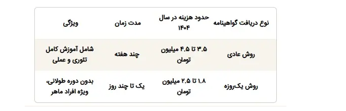 هزینه دریافت گواهینامه در روش عادی بین ۳ میلیون و ۵۰۰ هزار تومان تا حدود ۴ میلیون و ۵۰۰ هزار تومان متغیر است. این مبلغ شامل هزینه کلاسهای تئوری، جلسات عملی، بیمه هنرجو، هزینه آزمونها و بخشی از هزینههای اداری صدور گواهینامه میشود.