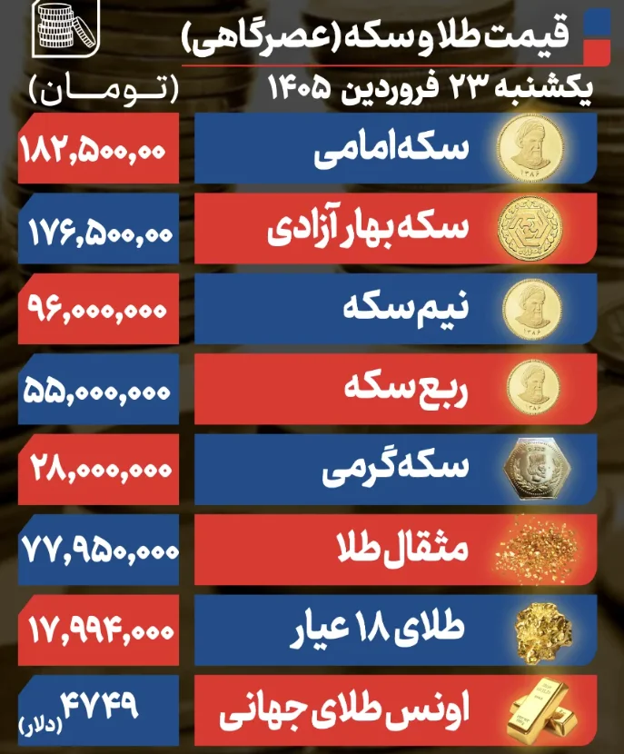 براساس اعلام اتحادیه طلا و جواهر تهران قیمت سکه امامی در لحظه نگارش این گزارش روی رقم ۱۸۲ میلیون و ۵۰۰ هزار تومان معامله شد و سکه بهار آزادی نیز روی رقم ۱۷۶ میلیون و ۵۰۰ هزار تومان ایستاد. این قطعات به ترتیب کاهشهای یک میلیون تومانی و ۵۰۰ هزار تومانی نسبت به بازگشایی بازار داشتند.