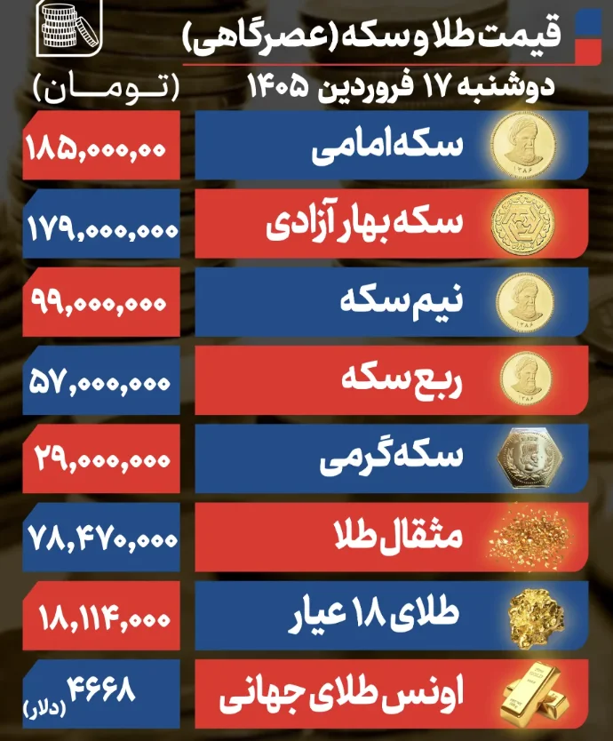 قیمت سکه امامی با رقم ۱۸۵ میلیون تومان توسط اتحادیه طلا و جواهر اعلام شد. سکه بهار آزادی روی رقم ۱۷۹ میلیون تومان قرار گرفت. قطعات سنگین سکه در سومین روز هفته با رشدهای بیش از یک میلیون تومانی نسبت به روز یکشنبه معامله شدند. نیمسکه و ربع سکه به ترتیب با رقمهای ۹۹ میلیون و ۵۷ میلیون تومان معامله شدند. سکه گرمی نیز با رقم ۲۹ میلیون تومان داد و ستد شد.