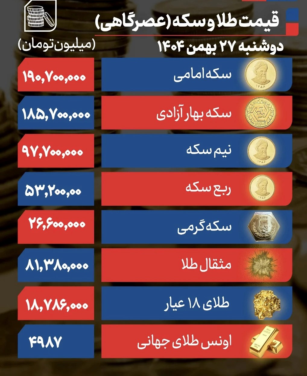 قیمت سکه امامی در سومین روز هفته روی قیمت ۱۹۰ میلیون و ۷۰۰ هزار تومانی ایستاد و سکه بهار آزادی روی رقم ۱۸۵ میلیون و ۷۰۰ هزار تومانی معامله شد.