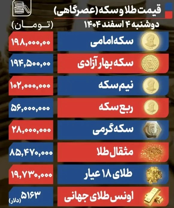 قیمت سکه امامی در سومین روز هفته روی قیمت ۱۹۸ میلیون تومان بسته شد و نسبت به روز یکشنبه کاهش یک میلیون تومانی داشت. سکه بهار آزادی روی رقم ۱۹۴ میلیون و ۵۰۰ هزار تومانی معامله شد و رشد ۵۰۰ هزار تومانی در مقیاس روزانه داشت.