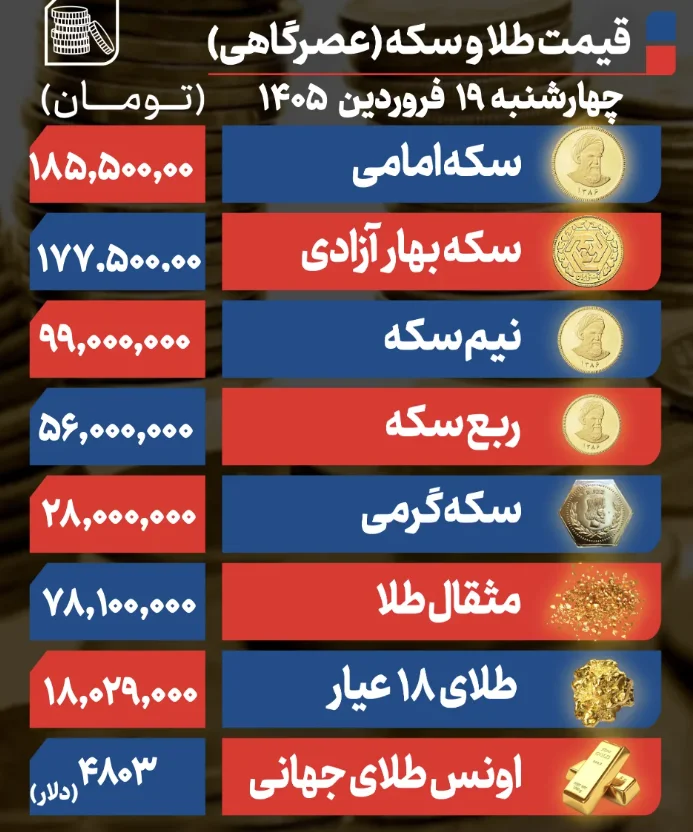 قیمت طلا و سکه در پنجمین روز هفته با حمایت ریزش قیمت دلار و سیگنال اخبار سیاسی مربوط به آتشبس ایران و آمریکا در تمام قطعات و وزنها افت میلیونی داشت. قیمت سکه امامی در معاملات عصرگاهی روز چهارشنبه ۱۹ فروردین به کانال ۱۸۵ میلیونی برگشت و طلای ۱۸ عیار در کف کانال ۱۸ میلیون تومانی معامله شد.