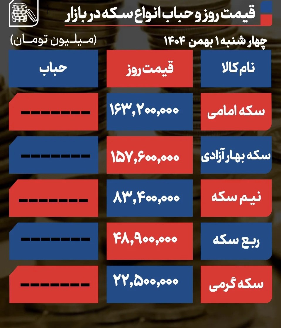 قیمت سکه امامی روز چهارشنبه با رشد چهار میلیون و ۸۰۰ هزار تومانی با رقم ۱۶۳ میلیون و ۲۰۰ هزار تومانی معامله شد. سکه بهار آزادی در اولین روز بهمن رشد چهار میلیون و ۳۰۰ هزار تومانی داشت و روی رقم ۱۵۷ میلیون و ۶۰۰ هزار تومانی ایستاد.