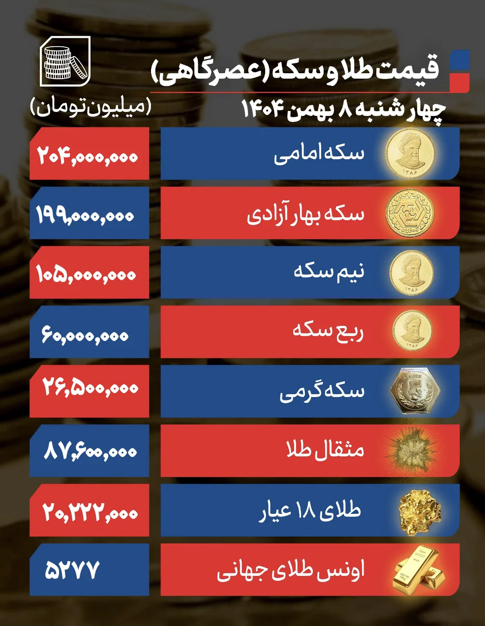 قیمت سکه امامی در پنجمین روز هفته روی قیمت ۲۰۴ میلیون تومان ایستاد و 23 میلیون تومانی داشت. سکه بهار آزادی روی رقم ۱۹۹ میلیون تومان معامله شد و 25 میلیون تومان افزایش ارزش داشت.