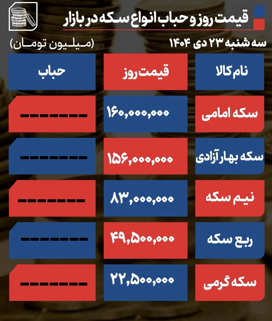 قیمت سکه امامی روز سهشنبه با کاهش یک میلیون و ۵۰۰ هزار تومانی با رقم ۱۶۰ میلیون تومان معامله شد. سکه بهار آزادی با کاهش دو میلیون تومانی روی رقم ۱۵۶ میلیون تومانی ایستاد.