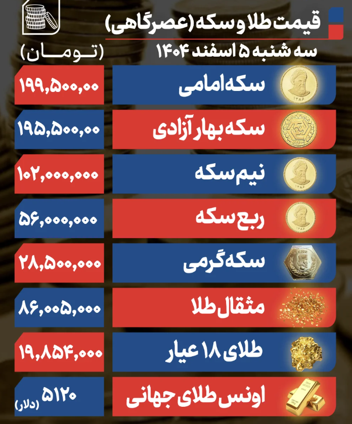 قیمت طلا و سکه در معاملات روز سهشنبه ۵ اسفند ۱۴۰۴، در حالی با رشد نسبی بازگشایی شد که در ادامه روز تحت تأثیر افت قیمت اونس جهانی طلا بخشی از افزایشهای خود را پس داد. رشد ۱۱۰۰ تومانی قیمت دلار مانع از ریزش شدید بازار طلا شد و باعث شد قیمتها در سطوح بالاتر از قیمتهای روز دوشنبه تثبیت شوند.