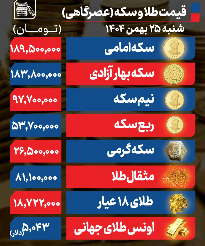 قیمت انواع قطعات سکه در روز شنبه کاهشی بود. قیمت سکه امامی 189 میلیون و 500 هزار تومان شد، قیمت سکه بهار آزادی به 183 میلیون و 800 هزار تومان رسید و قیمت نیمسکه 97 میلیون و 700 هزار تومان شد. قیمت ربع سکه نیز 53 میلیون و 700 هزار تومان شد و سکه گرمی با قیمت 26 میلیون و 500 هزار تومان مورد معامله قرار گرفت.
