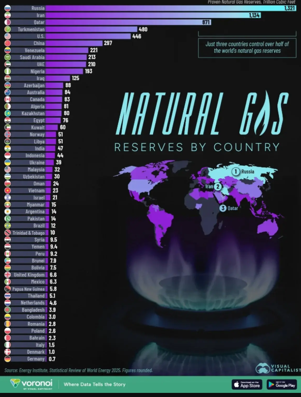 این اینفوگرافی، کشورها را بر اساس ذخایر اثباتشده گاز طبیعی، بر حسب تریلیون فوت مکعب، رتبهبندی میکند. دادههای این اینفوگرافی از گزارش آماری انرژی جهان سال ۲۰۲۵ مؤسسه انرژی استخراج شده است.