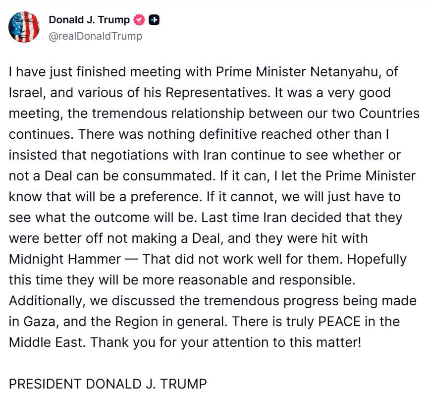رئیس جمهور آمریکا اعلام کرد: هیچ نتیجه قطعی از این دیدار به دست نیامد جز اینکه من بر ادامه مذاکرات با ایران تأکید کردم تا ببینیم آیا توافقی ممکن است حاصل شود یا نه.