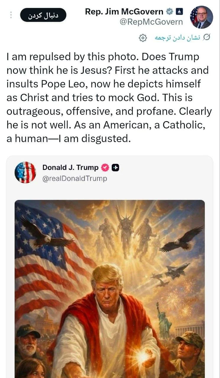 به گزارش هفت صبح جیم مکگاورن نماینده دموکرات کنگره در واکنش به تصویرسازی ترامپ از خودش در قامت حضرت عیسی نوشت:
