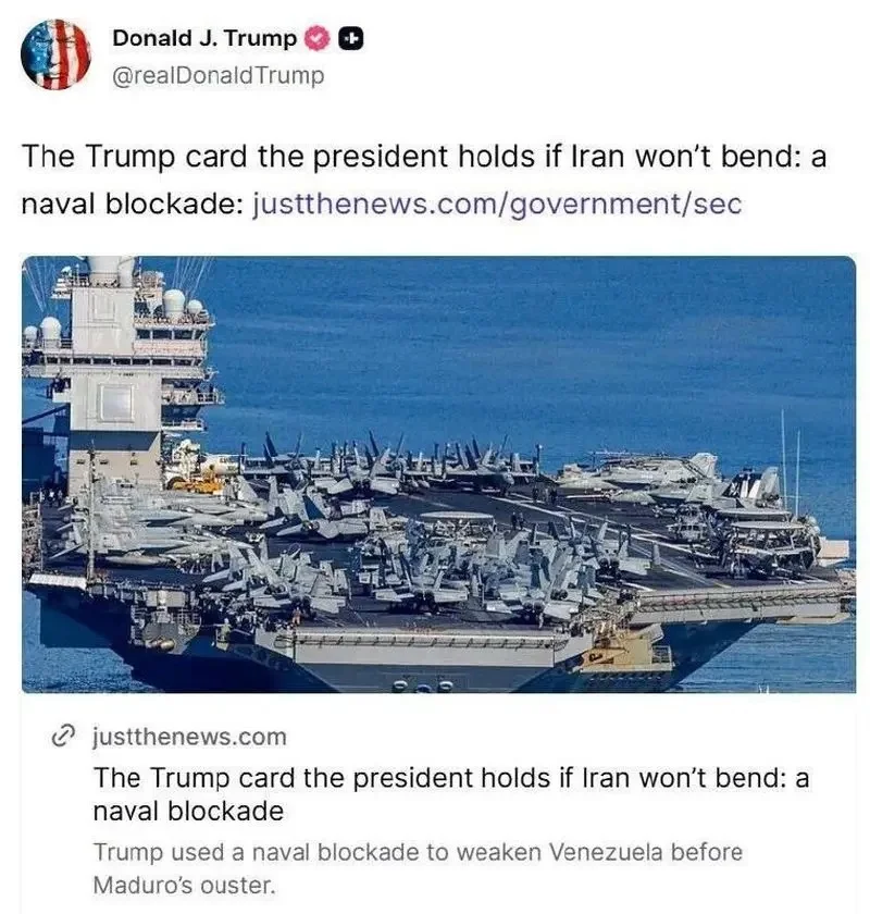 دونالد ترامپ پس از مذاکرات ناموفق، مقالهای با این عنوان را بازنشر کرد: "اگر ایران کوتاه نیاید کارت آمریکا: محاصره دریایی"