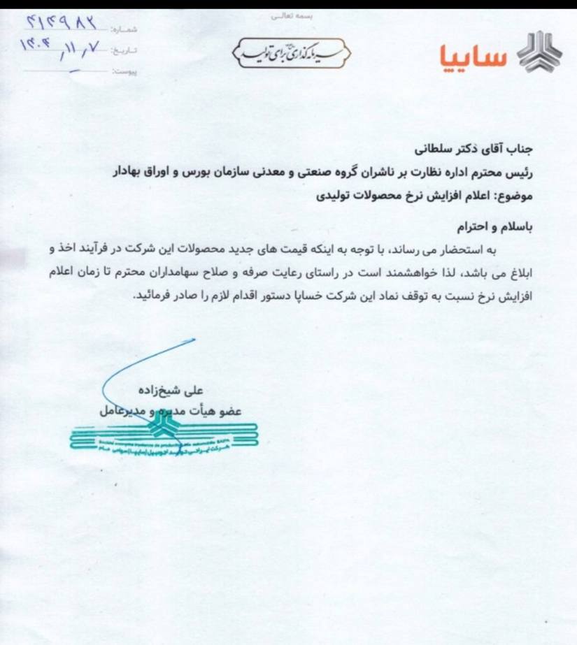 به استحضار میرساند، با توجه به اینکه قیمتهای جدید محصولات این شرکت در فرآیند اخذ و ابلاغ میباشد، لذا خواهشمند است در راستای رعایت صرفه و صلاح سهامداران محترم، تا زمان اعلام افزایش نرخ، نسبت به توقف نماد این شرکت حسبالامر دستور اقدام لازم را صادر فرمایید.