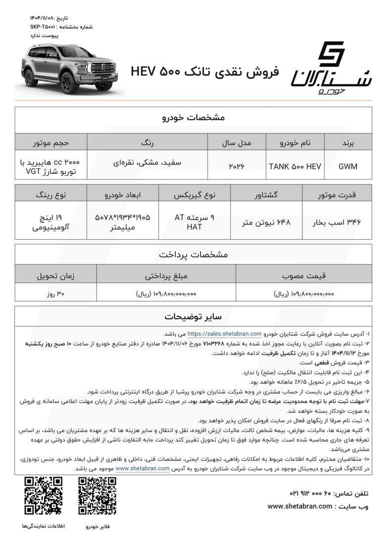 به گزارش هفت صبح، شرکت شتابران خودرو اولین شرایط فروش شاسی بلند تانک ۵۰۰ را ویژه بهمن ماه ۱۴۰۴ اعلام کرد؛ فروش فوری و تحویل ۳۰ روزه. شرکت شتابران خودرو اولین شرایط فروش شاسی بلند تازه وارد چینی خود را ویژه بهمن ماه ۱۴۰۴ اعلام کرد. در این شرایط فروش شتابران خودرو، شاسی بلند چینی تانک ۵۰۰ به صورت فروش فوری عرضه می شود. موعد تحویل اعلامی برای این خودرو ۳۰ روزه است. قیمتی که برای تانک ۵۰۰ هیبرید در بخشنامه بهمن ماه ۱۴۰۴ اعلام شده با احتساب کلیه هزینه های جانبی ۱۰,۹۸۰,۰۰۰,۰۰۰ تومان است.