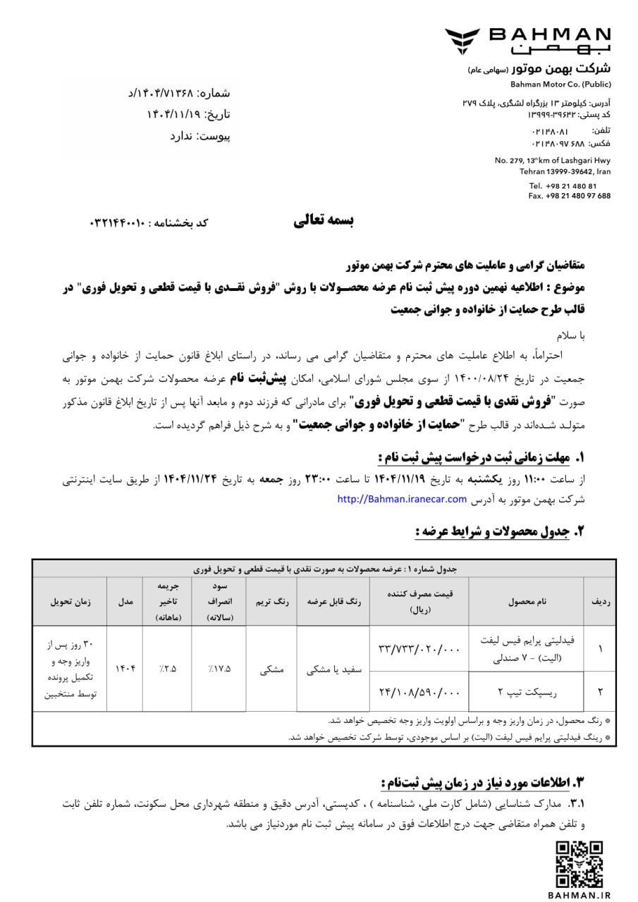 گروه بهمن بخشنامه فروش دو مدل فیدلیتی الیت 7 نفره و ریسپکت 2 را با قیمتهای نهایی جدید ویژه بهمن ماه 1404 اعلام کرد.